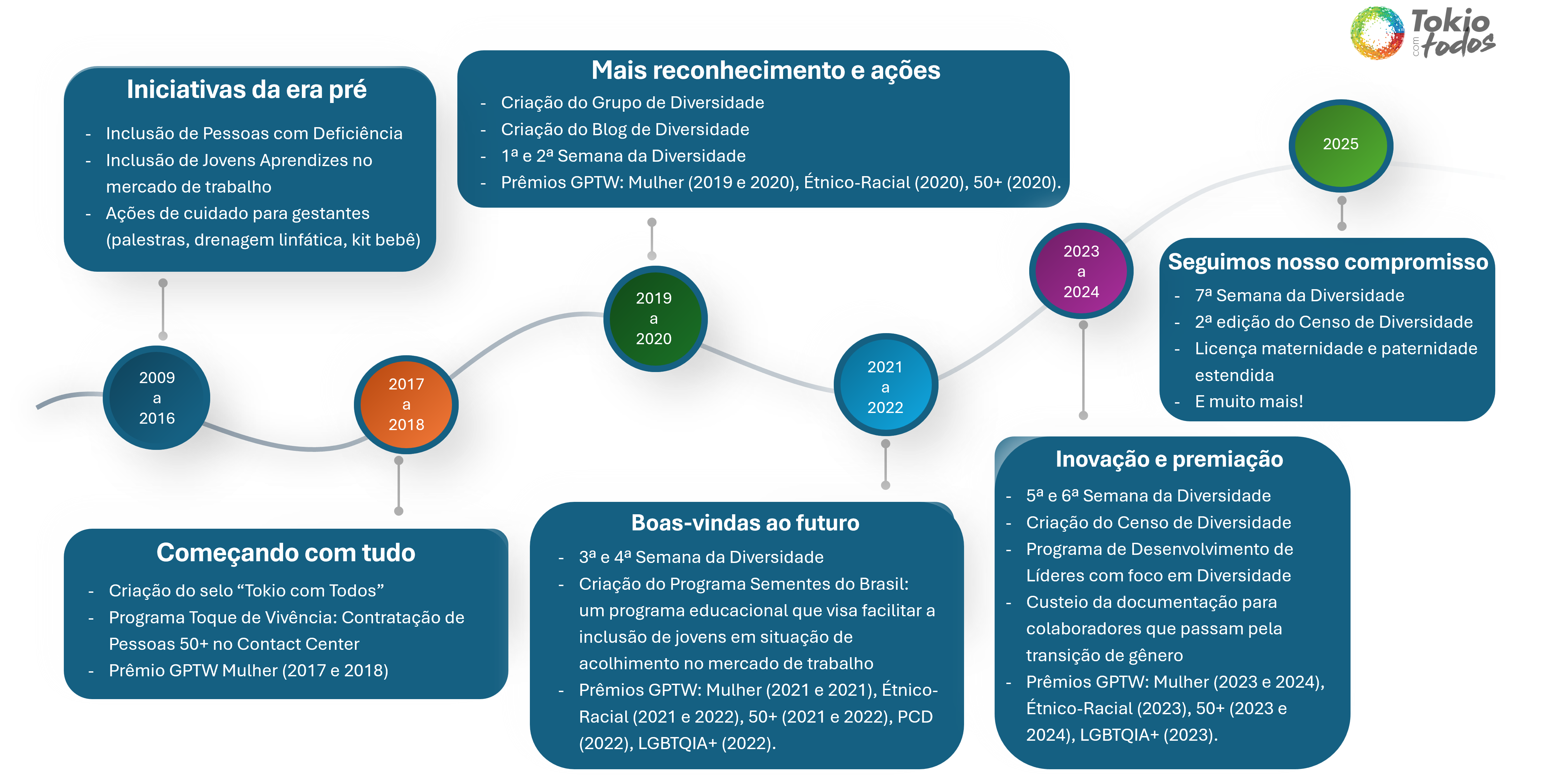 Visando a construção de um ambiente de trabalho mais diverso, equitativo e inclusivo, criamos o selo Tokio Com Todos: um símbolo do nosso compromisso em reconhecer, respeitar e valorizar as diferenças. O selo marcou o início de uma trajetória de aprendizado e evolução, com avanços significativos nos cinco pilares da diversidade que guiam nossas ações: Gênero, Raça, Pessoas com Deficiência, Gerações e LGBTQIAPN+.